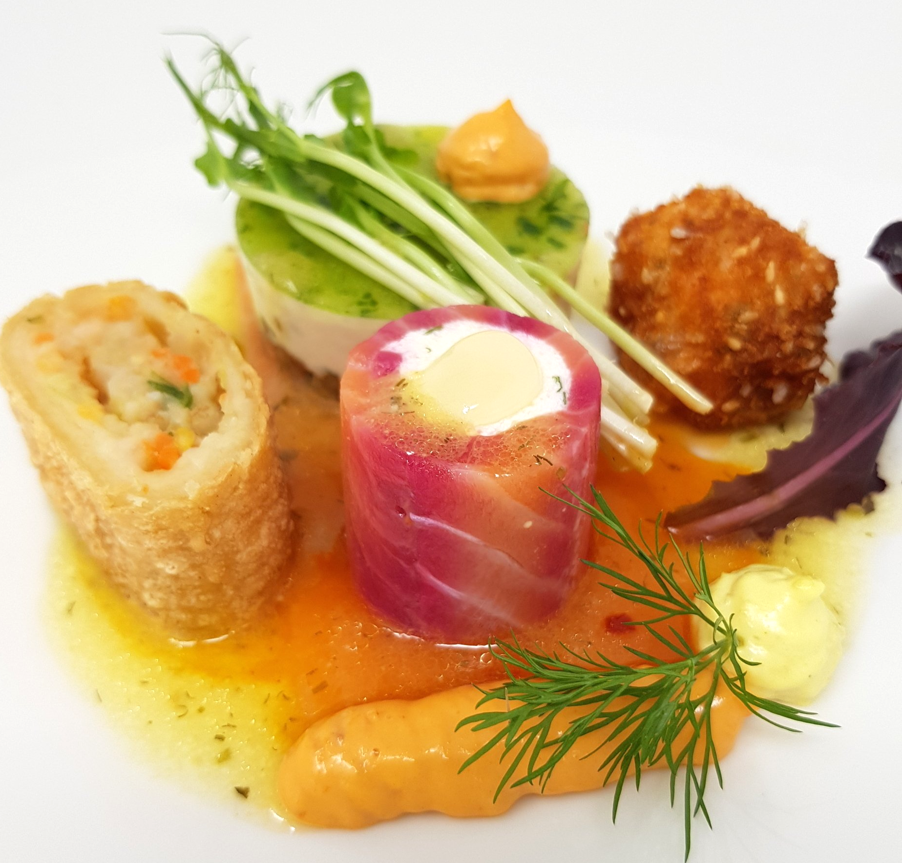 - Törtchen vom Räucherlachstartar mit Ingwer Mousse